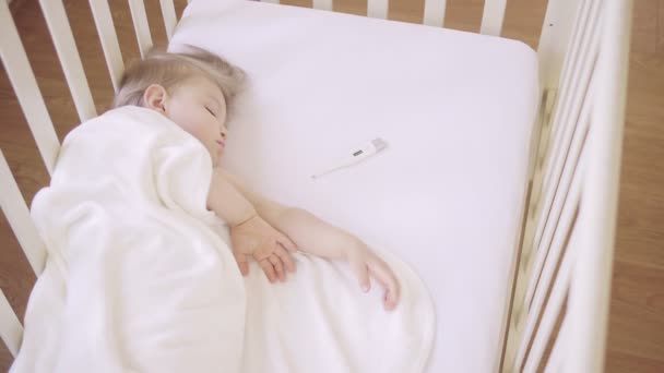 Baby Girl 2 Years Old Sleeping In A Crib Covered White Blanket Next To The Child Lies An Electronic Thermometer Daytime Sleep Video By C Frame 2016 Stock Footage 198253304