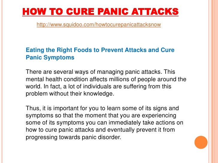 Is panic disorder curable. Panic attacks can be very frightening. Some research shows that practicing a diet designed for stress management as one of many promising cures for panic attacks.