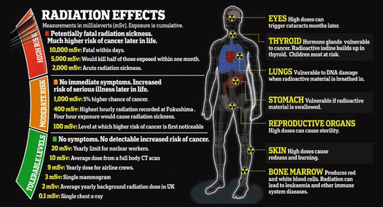 A group of 240 scientists reviewed these studies and became concerned. Radiation sickness can be acute happening soon after exposure or chronic where symptoms appear over time or after some time possibly years later. Even discounting these extreme cases there are a whole bunch of common side effects of radiation.